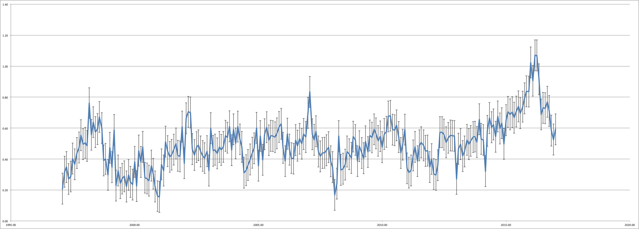 Fast jag står fast vid att ENSO inte lämnar något bidrag till en uppvärmning. Om det är en högre nivå efter en svängning där, är det för att det finns en bakomliggande trend. Om El Niño’s blir vanligare på bekostnad av motsatsen, ser atmosfärsmätningarna varmare ut i snitt, men det är ändå inte en del av en långsiktig uppvärmning.