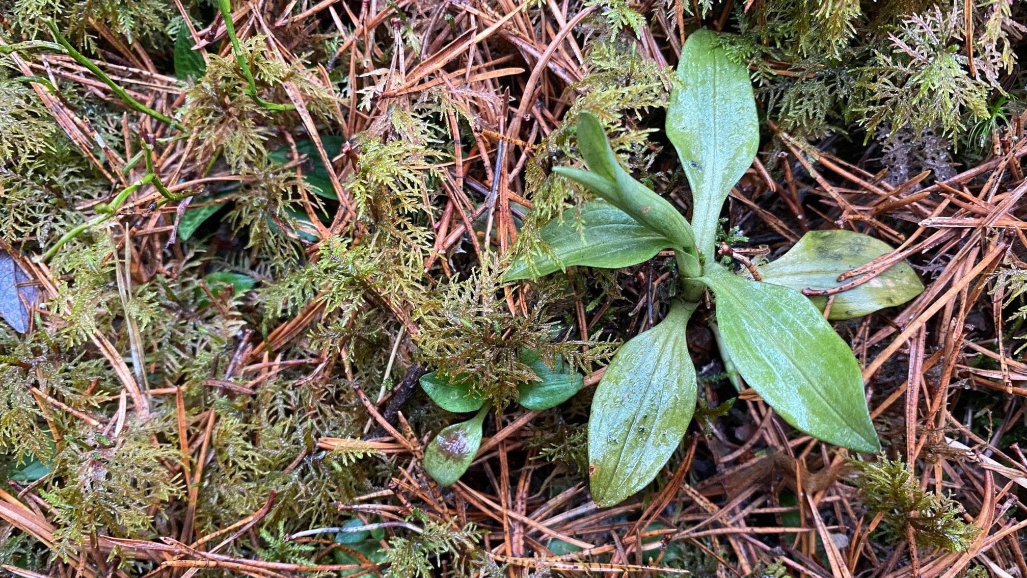 Ut och leta! Det är den enda vintergröna orkidén så den är som lättast att hitta just nu. Så här ser den ut så här års: